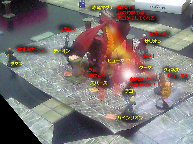 赤竜の胸から剥がれたドラゴンドロップをクリスタルグローブにセットするパーティ達。