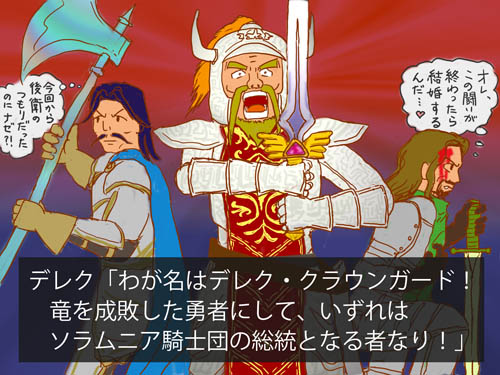 デレク「ヴィヌクよ。ソラムニア騎士の教えを忘れたか!敵を前にして逃亡するとは名誉を捨てることと同じだ」